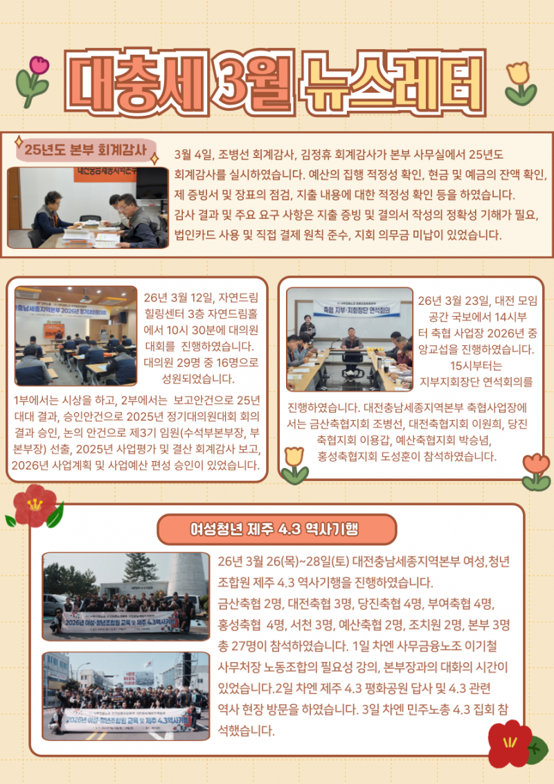 대전충남세종 | 대전충남세종지역본부 3월 뉴스레터 페이지 정보 작성자 대전충남세종 작성일26-04-13 14:58 조회5회 댓글0건 관련링크 다음글 목록 본문 대전충남세종지역본부 3월 뉴스레터 댓글목록 등록된 댓글이 없습니다. 다음글 목록
