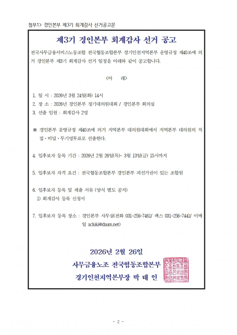 경인본부 2026년 회계감사 선거공고 페이지 정보 작성자 경기인천 작성일26-02-26 09:03 조회8회 댓글0건 관련링크 이전글 다음글 목록 본문 경인본부 2026년 회계감사 선거공고 댓글목록 등록된 댓글이 없습니다. 이전글 다음글 목록