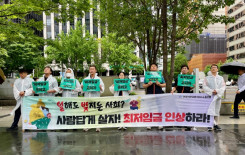 최저임금 임금수준 올리고! 최저임금 적용대상 넓히고! 최저임금 잘못된법 고치자!6월 25일(수) 오전 8시부터 여의도역 5번출구 앞에서 사무금융노조 최저임금 인상 출근선전전을 진행했다.