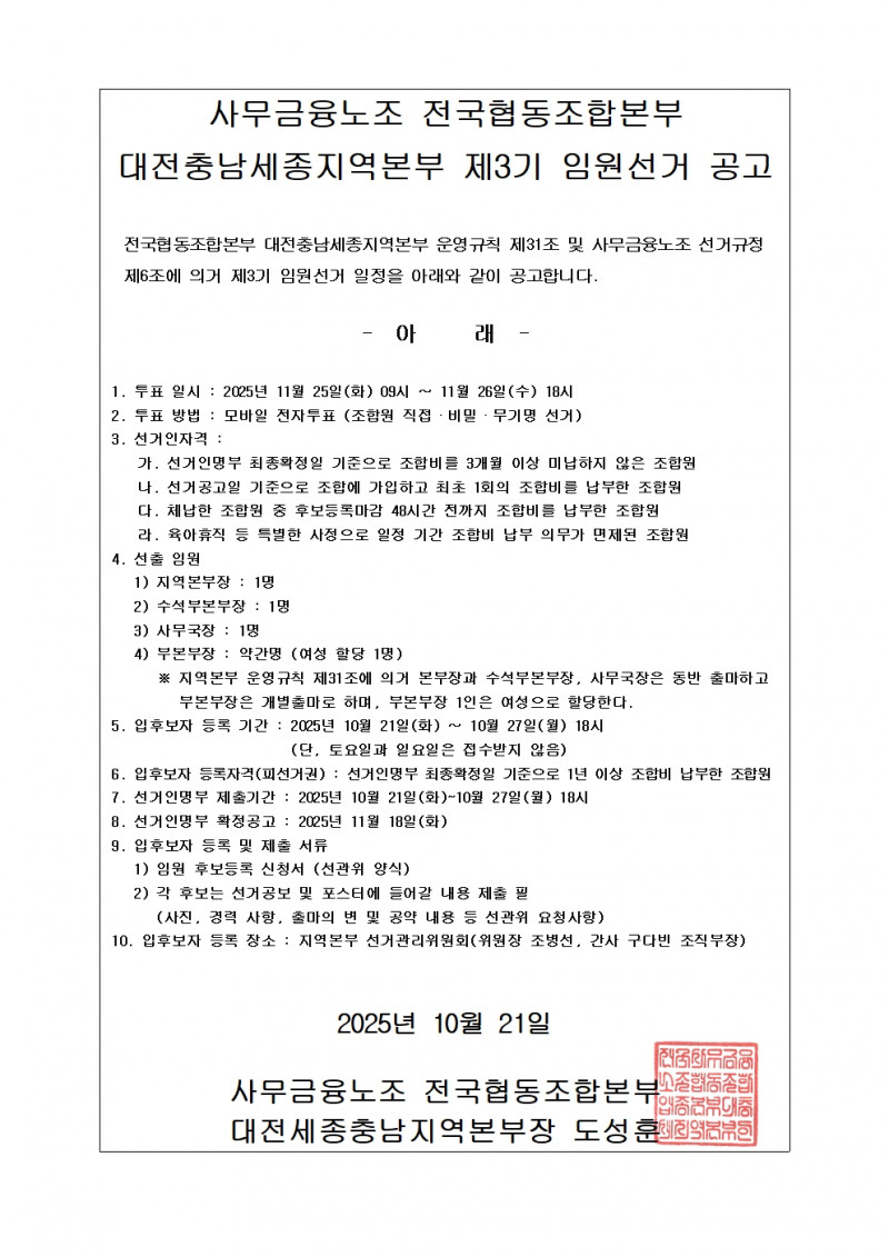 3기임원선거 | 대전충남세종지역본부 제3기 임원선거 공고문 페이지 정보 작성자 구다빈 작성일25-10-21 17:39 조회16회 댓글0건 관련링크 이전글 다음글 목록 본문 대전충남세종지역본부 제3기 임원선거 공고문 댓글목록 등록된 댓글이 없습니다. 이전글 다음글 목록