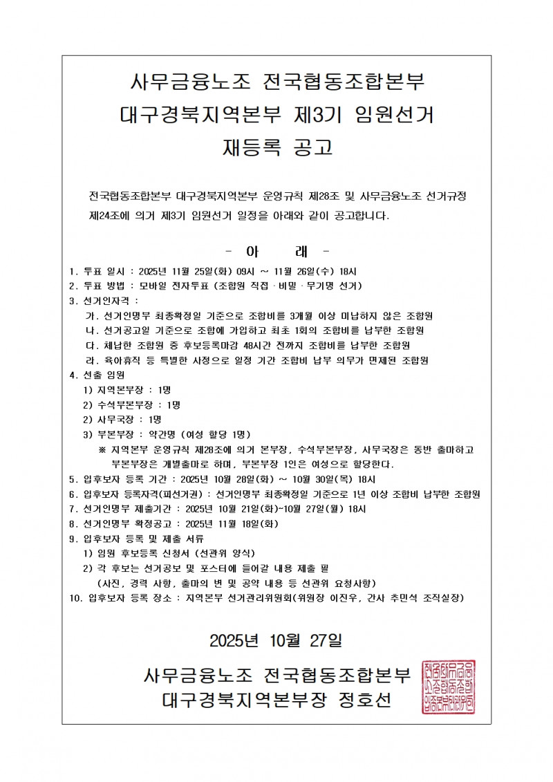 3기임원선거 | 대경본부 3기 임원선거 재등록 공고 페이지 정보 작성자 조직 작성일25-10-27 18:08 조회15회 댓글0건 관련링크 이전글 다음글 목록 본문 대경본부 3기 임원선거 재등록 공고 댓글목록 등록된 댓글이 없습니다. 이전글 다음글 목록