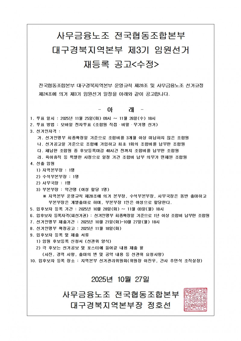 3기임원선거 | 대경본부 3기 임원선거 재등록공고<수정> 페이지 정보 작성자 조직 작성일25-10-30 16:09 조회23회 댓글0건 관련링크 이전글 다음글 목록 본문 대경본부 3기 임원선거 재등록공고<수정> 댓글목록 등록된 댓글이 없습니다. 이전글 다음글 목록