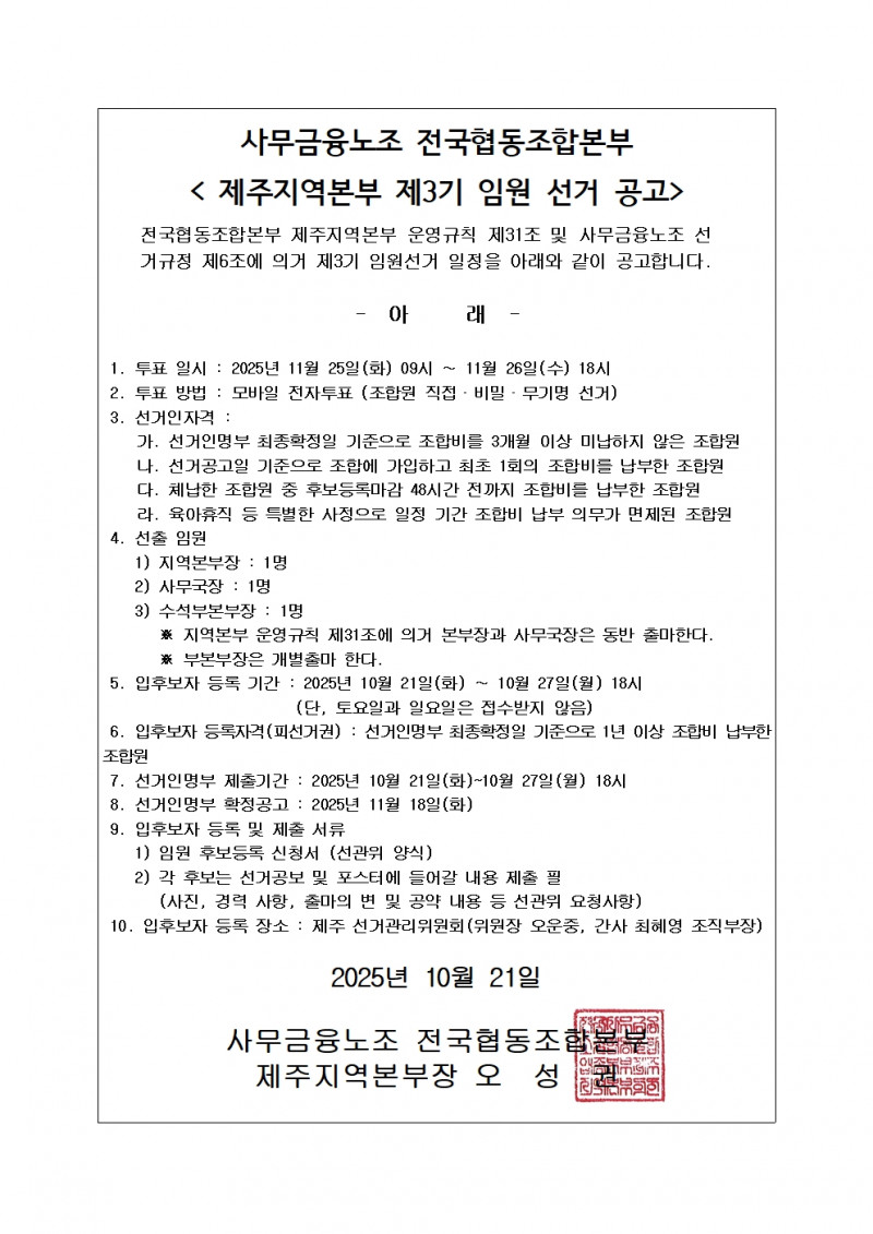 3기임원선거 | 제주본부 3기 임원선거를 공고 페이지 정보 작성자 최혜영 작성일25-10-21 16:30 조회10회 댓글0건 관련링크 이전글 다음글 목록 본문 제주본부 3기 임원선거를 공고합니다. 댓글목록 등록된 댓글이 없습니다. 이전글 다음글 목록