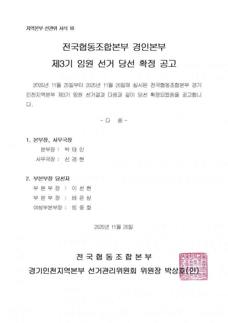 3기임원선거 | 경인본부 제3기 임원 선거 당선 확정 공고 페이지 정보 작성자 경기인천 작성일25-11-26 20:15 조회13회 댓글0건 관련링크 이전글 다음글 목록 본문 251126-경인본부 제3기 임원 선거 당선 확정 공고 댓글목록 등록된 댓글이 없습니다. 이전글 다음글 목록