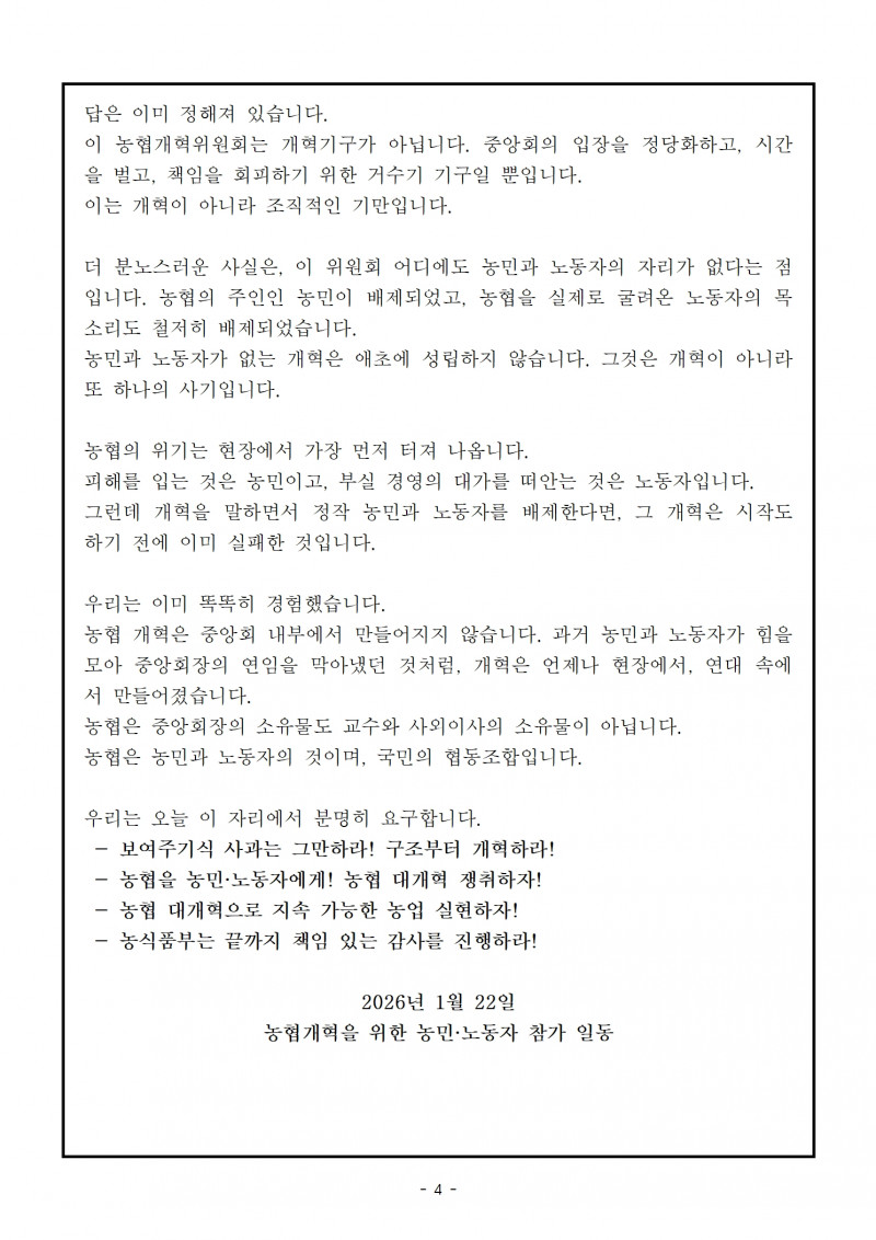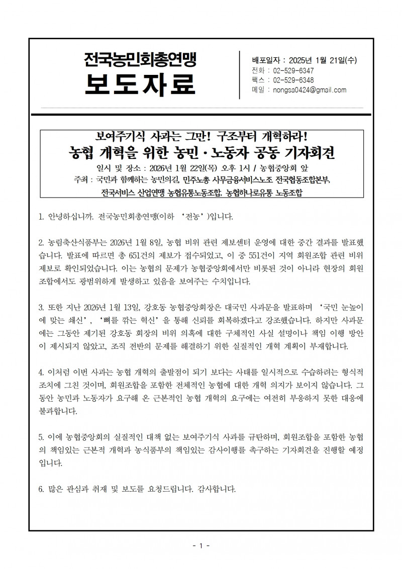 보도 | 260122 보도자료) 농협개혁 쟁취! 농민,노동자 공동 기자회견