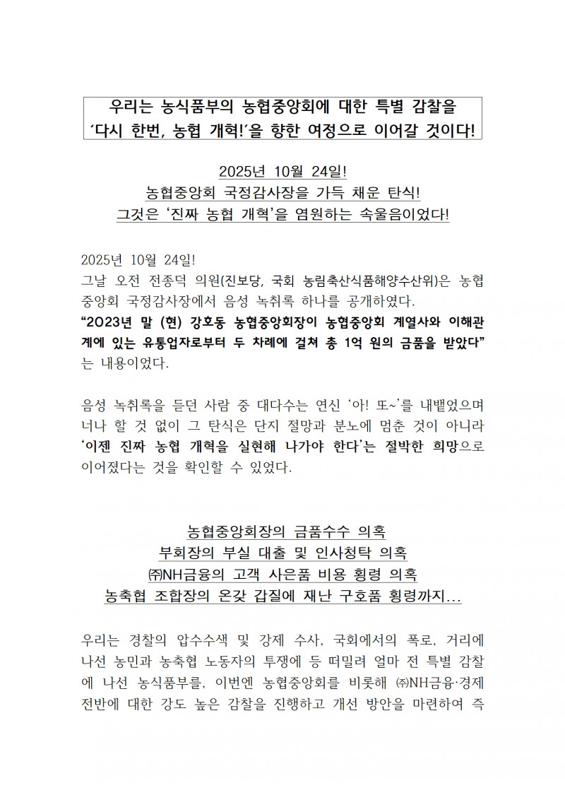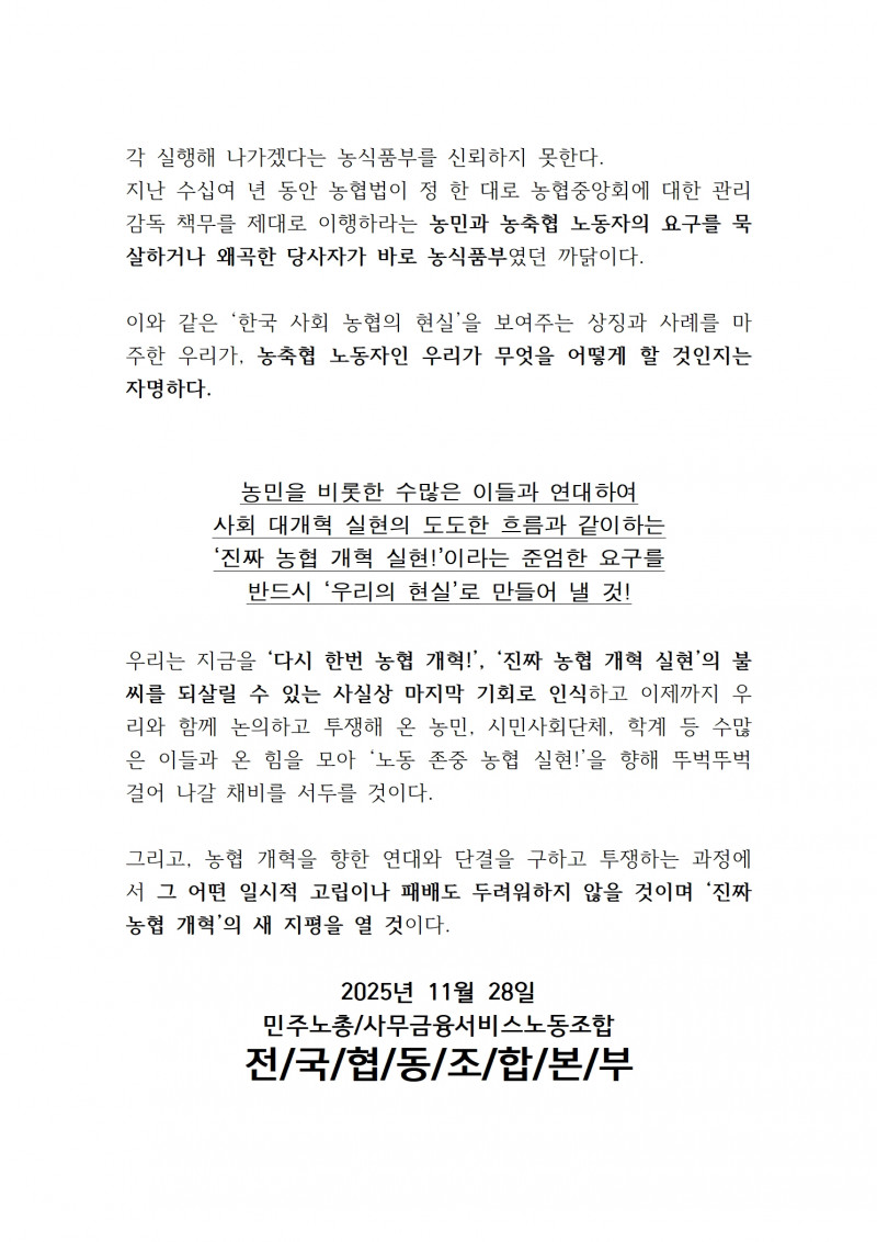 성명 | 251128 성명> 분노와 규탄을 넘어 농협 대개혁 쟁취하자!!!