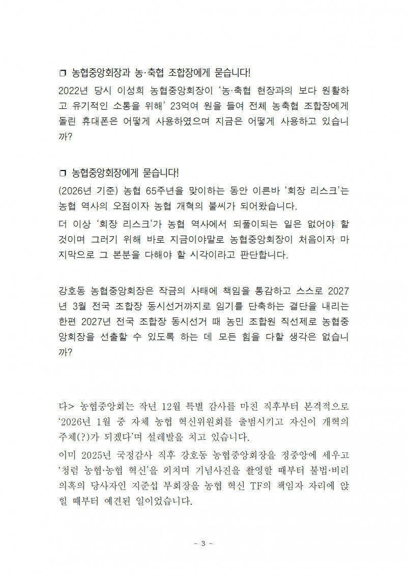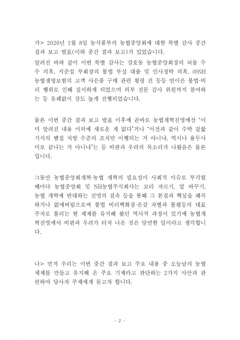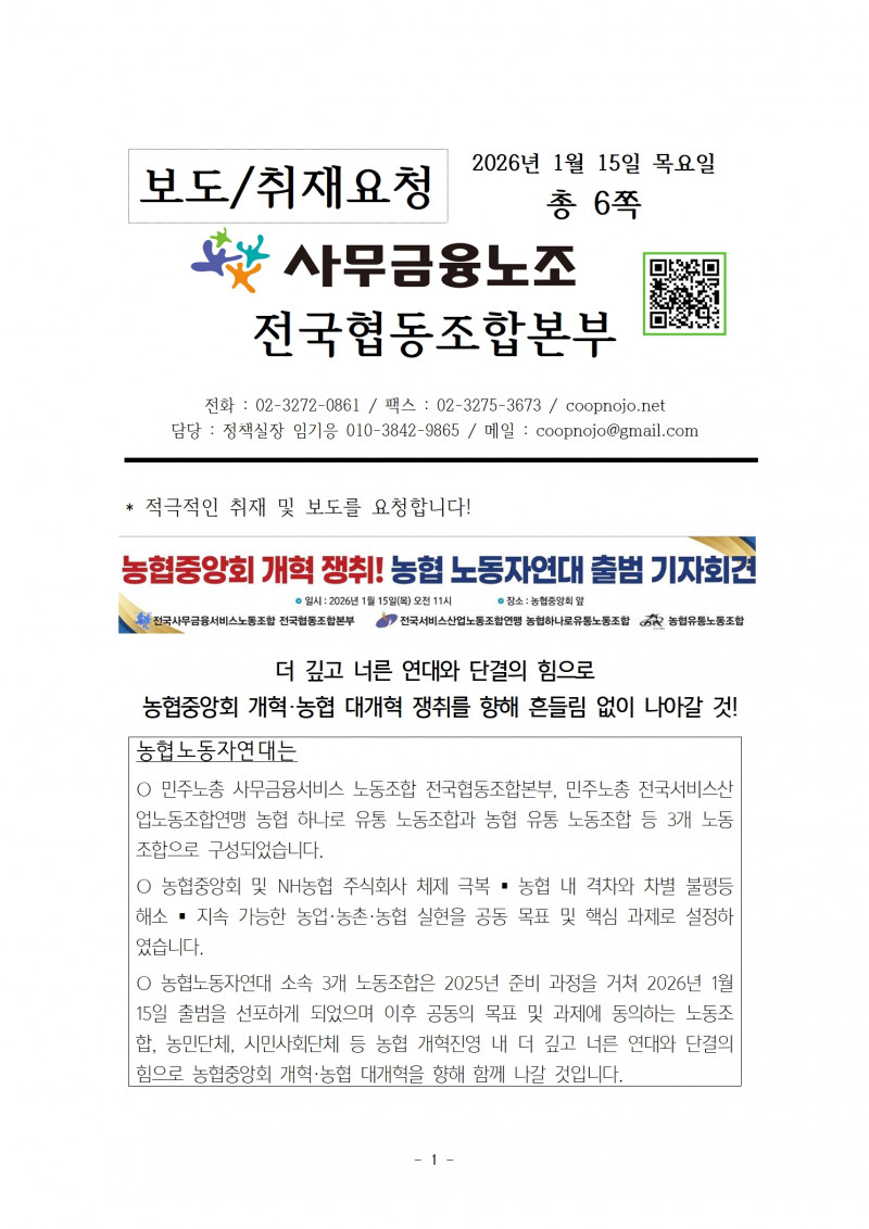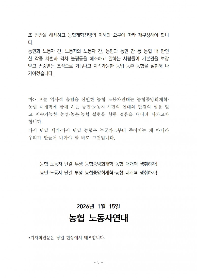 보도 | 260115 보도자료) 농협 노동자연대 출범 선포 기자회견 페이지 정보 작성자 협동조합업종본부 작성일26-01-13 13:00 조회15회 댓글0건 관련링크 다음글 목록 본문 * 오전 11시 댓글목록 등록된 댓글이 없습니다. 다음글 목록