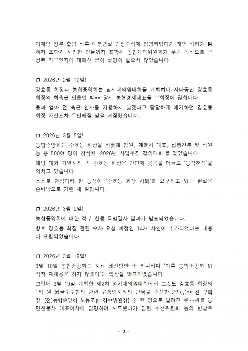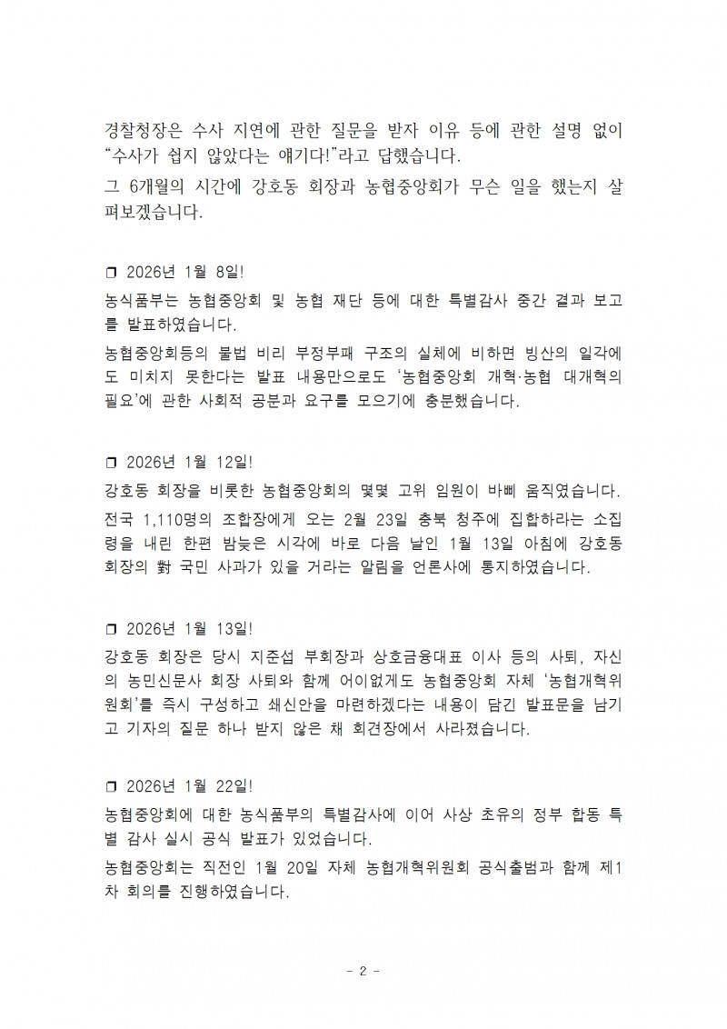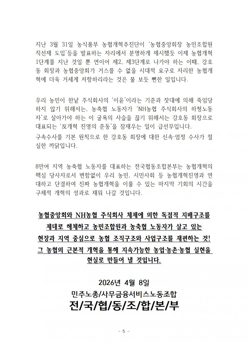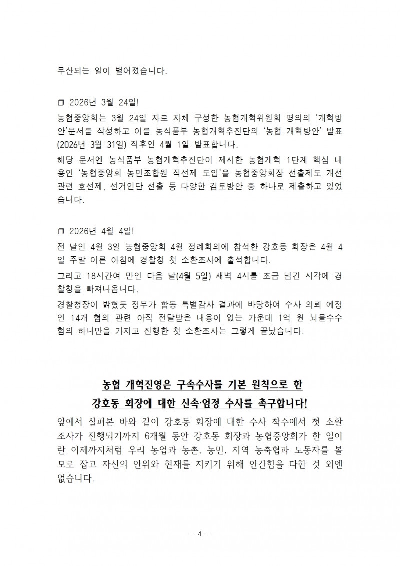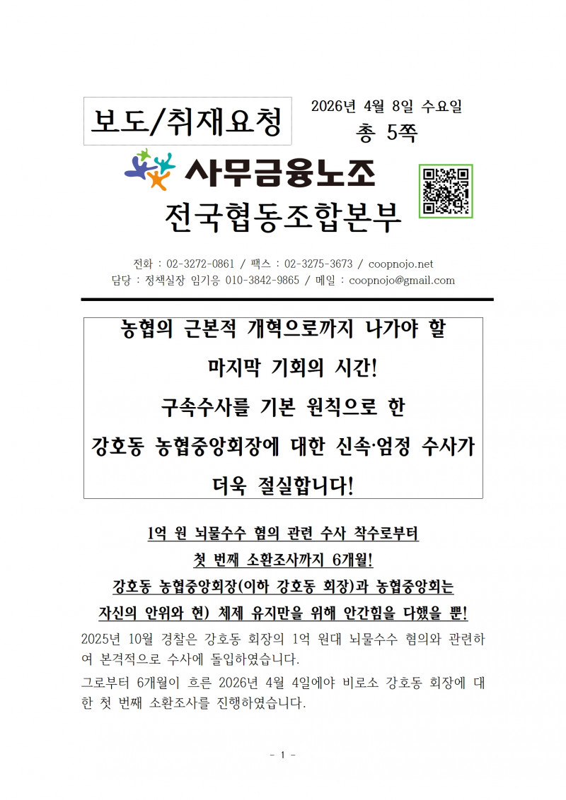 보도 | 260408보도) 강호동 회장을 즉각 구속 수사하라! 페이지 정보 작성자 협동조합업종본부 작성일26-04-08 09:33 조회28회 댓글0건 관련링크 다음글 목록 본문 *붙임 댓글목록 등록된 댓글이 없습니다. 다음글 목록