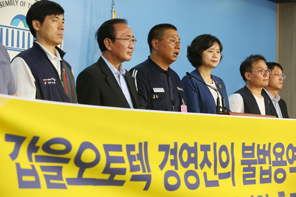 민주노총과 정의당·금속노조는 26일 오후 국회 정론관에서 기자회견을 열고 "전직 경찰·특전사를 고용해 노조를 파괴하려 한 갑을오토텍은 자신의 잘못을 반성하고 용역깡패 투입 계획을 철회하라"고 밝혔다. 지회에 따르면 갑을오토텍은 29일부터 경비용역 200여명을 공장에 투입한다. 다음달 1일부터는 인원을 늘려 400~500명의 경비용역을 배치할 것으로 전해졌다. 8월1일부터 5일까지는 여름휴가 기간이다. 갑을오토텍의 이 같은 행위는 2012년 만도에서 벌어진 노조파괴 프로그램과 궤를 같이한다. 당시 만도는 여름휴가 전날 직장폐쇄를 단행하고 용역 투입에 이어 금속노조 조합원 공장 밖 퇴거 후 친기업노조 설립, 선별 복귀를 진행했다. 이 과정을 거치며 금속노조 만도지부는 영향력이 급격히 감소됐다. 기자회견 참가자들도 이 같은 사태를 예상했다. 노회찬 정의당 원내대표는 "과거 갑을오토텍은 깡패나 다름없는 용역을 고용해 노조를 만들고, 공장에 복귀하려는 노동자들에게 폭력을 가해 물의를 빚었다"며 "정부는 임박한 사측의 폭력 앞에 공포를 호소하는 갑을오토텍 노동자들을 외면해서는 안 된다"고 말했다. 이재헌 지회장은 "사측의 직장폐쇄는 노조파괴를 목적으로 한 엄연한 불법행위"라며 "회사의 불법행위를 막는 것이 조합원뿐 아니라 관리직 직원들의 생존까지 지키는 일이라 보고 모든 방법을 강구해 대처하겠다"고 말했다. 한편 이날 지회와 사측이 갑을오토텍 공장에서 벌인 61차 보충교섭은 성과 없이 종료됐다. 갑을오토텍 생산직 직원 가족들은 '가족대책위원회'를 꾸려 이날 저녁 충남 아산시 아산경찰서 앞에서 촛불집회를 열었다. 용역투입 후 발생하게 될 혹시 모를 불상사를 막아 달라는 취지다. | ||||||